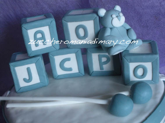...ed ecco la Tamburino cake!!!!! Come da richiesta di mamma Elena, che si è innamorata della celebre torta realizzata dalla cake designer Karen Taylor, celebrata nel suo libro "Drummer Boy", ho realizzato una "copia" della torta di battesimo della cake designer!!!! Ovviamente ho apportato un'unica modifica: ho realizzato 6 cubi che andassero a comporre il nome del piccolo Jacopo, per il resto abbiamo mantenuto tutto fedele, compresa la tonalità!!!! Vi devo confessare che è stata una bella sfida, avevo paura di non essere all'altezza, insomma parliamo di una torta di Karen Taylor!!!! Tutto sommato però, credo di aver superato la prova, mamma e papà sono stati soddisfatti della torta e speriamo sia anche piaciuta????!!!!! Infine ad accompagnare la cake ho realizzato anche dei biscottini baby!!! Ora non vi annoio più e vi lascio alle foto ciao ciao!!!!!!